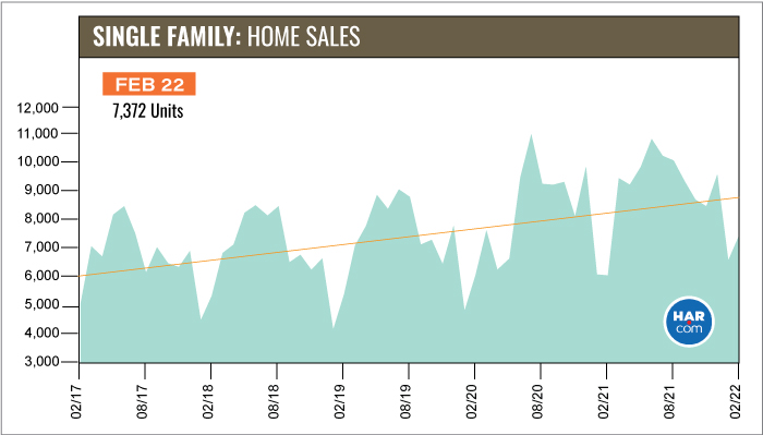 According to the Houston Association of Realtors’ (HAR) February 2022 Market Update, single-family home sales jumped 22.9 percent with 7,372 units sold compared to 5,997 in February of 2021. Compared to the last “normal” February – in 2020 – sales volume was up 23.3 percent. With fewer housing options available for purchase, consumers placed heavy demand on single-family rental homes in February.