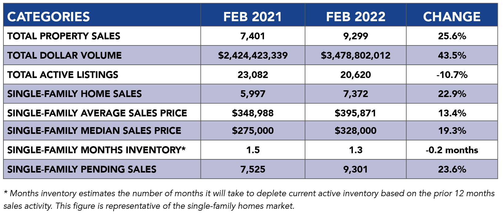- Single-family home sales rose 22.9 percent year-over-year. A figure likely skewed as a result of the freeze last year that interrupted real estate transactions for days on end. When compared to the last “normal” February, in 2020, sales volume increased 23.3 percent;