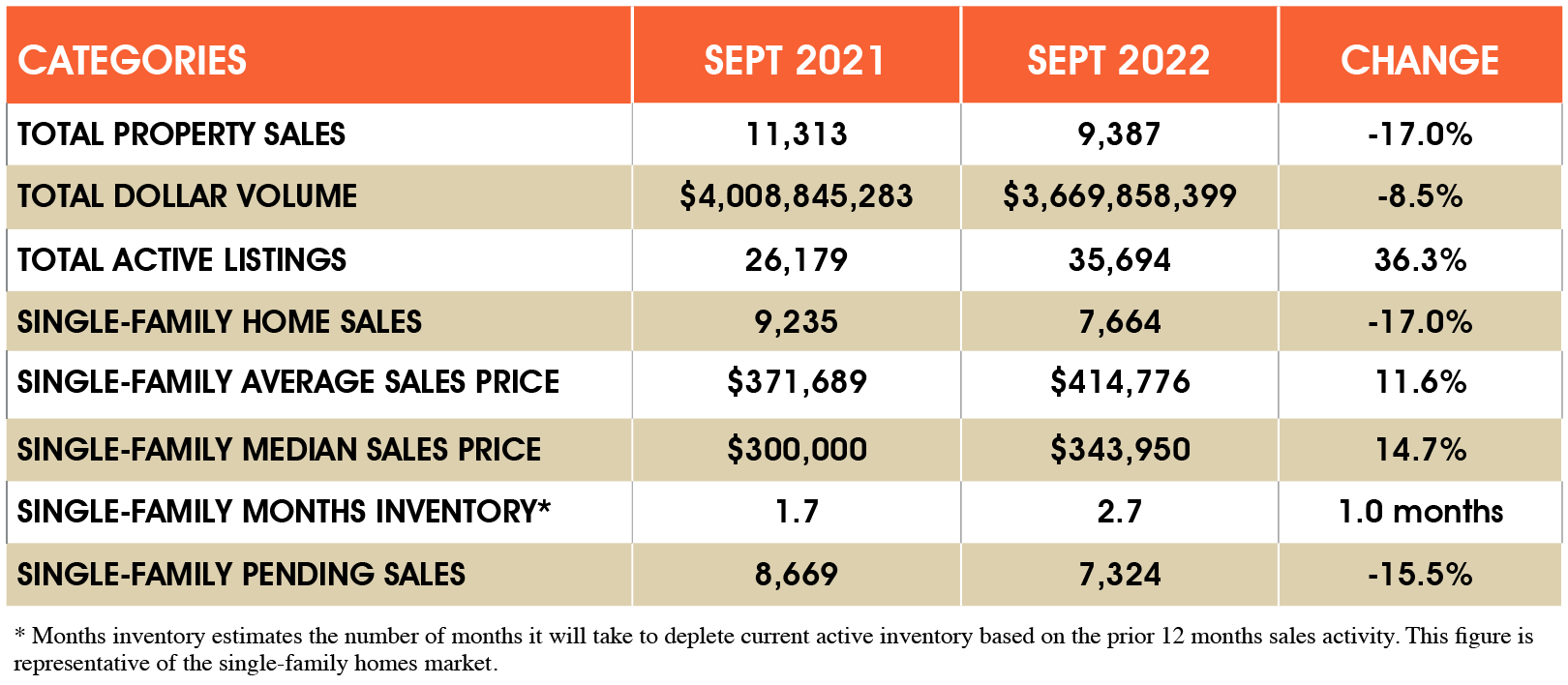 Market indicators provided mixed readings in September. In addition to the drop in single-family home sales, total property sales and total dollar volume declined and pending sales fell 15.5 percent. Active listings (the total number of available properties) jumped 36.3 percent.