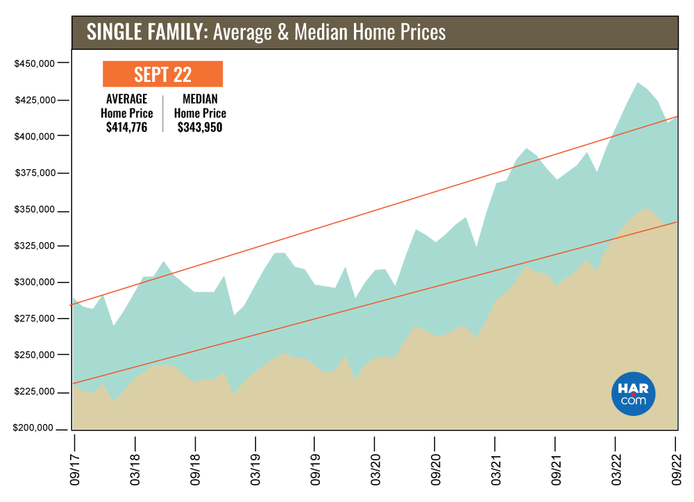 Housing across Greater Houston has experienced historic appreciation since the pandemic struck in early 2020. The average price of a single-family home rose 11.6 percent in September to $414,776 – well below the record high of $438,384 reached in May 2022. The median price jumped 14.7 percent to $343,950, which is also below the highest median of all time, $354,100, reached in June 2022. The average price for a single-family home in Houston first broke the $400,000 mark in March of this year. The median price has held above $300,000 since May of 2021.