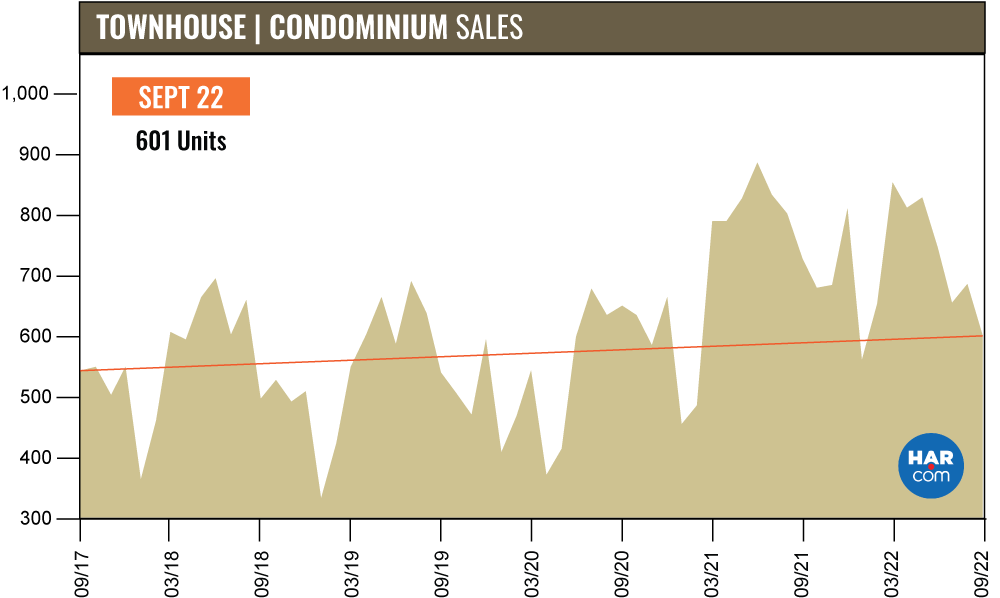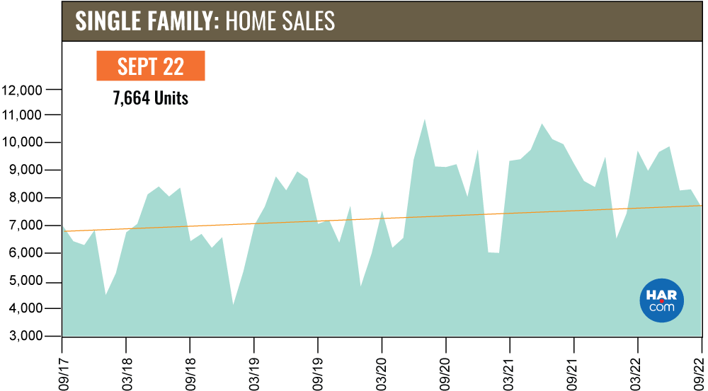 According to the Houston Association of Realtors’ (HAR) September 2022 Market Update, single-family home sales fell 17.0 percent, with 7,664 units sold compared to 9,235 in September 2021. On a year-to-date basis, the market now trails 2021’s record-setting volume by 5.1 percent.