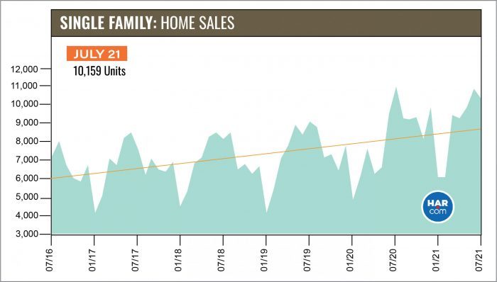 According to the Houston Association of Realtors (HAR) July 2021 Market Update, single-family homes sales were down 6.1 percent compared to last July, with 10,159 units sold versus the historic 10,822 that sold a year earlier. However, when compared to July 2019 — an average month of home sales with volume totaling 8,921 — the Houston housing market was up 13.9 percent. On a year-to-date basis, local home sales currently exceed 2020’s record pace by 19.1 percent.