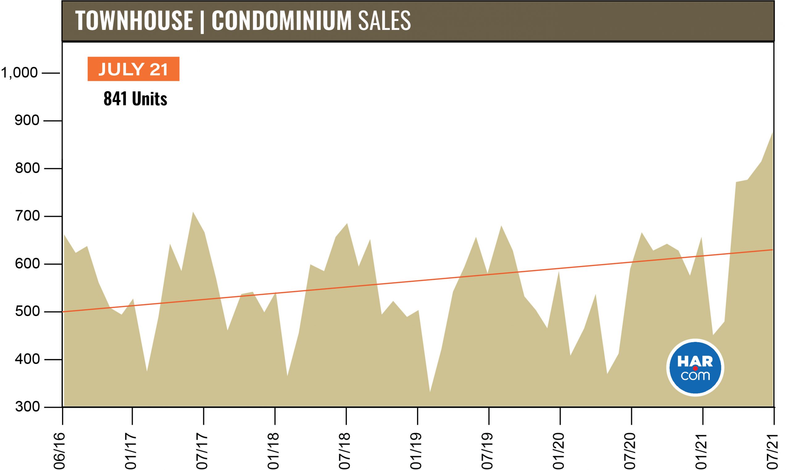 Sales of townhouses and condominiums increased for the eleventh consecutive month in July, jumping 23.9 percent with 841 closed sales versus 679 a year earlier. The average price rose 10.0 percent to $245,160 and the median price climbed 8.7 percent to $200,000. Inventory fell from a 4.1-months supply to 2.6 months.