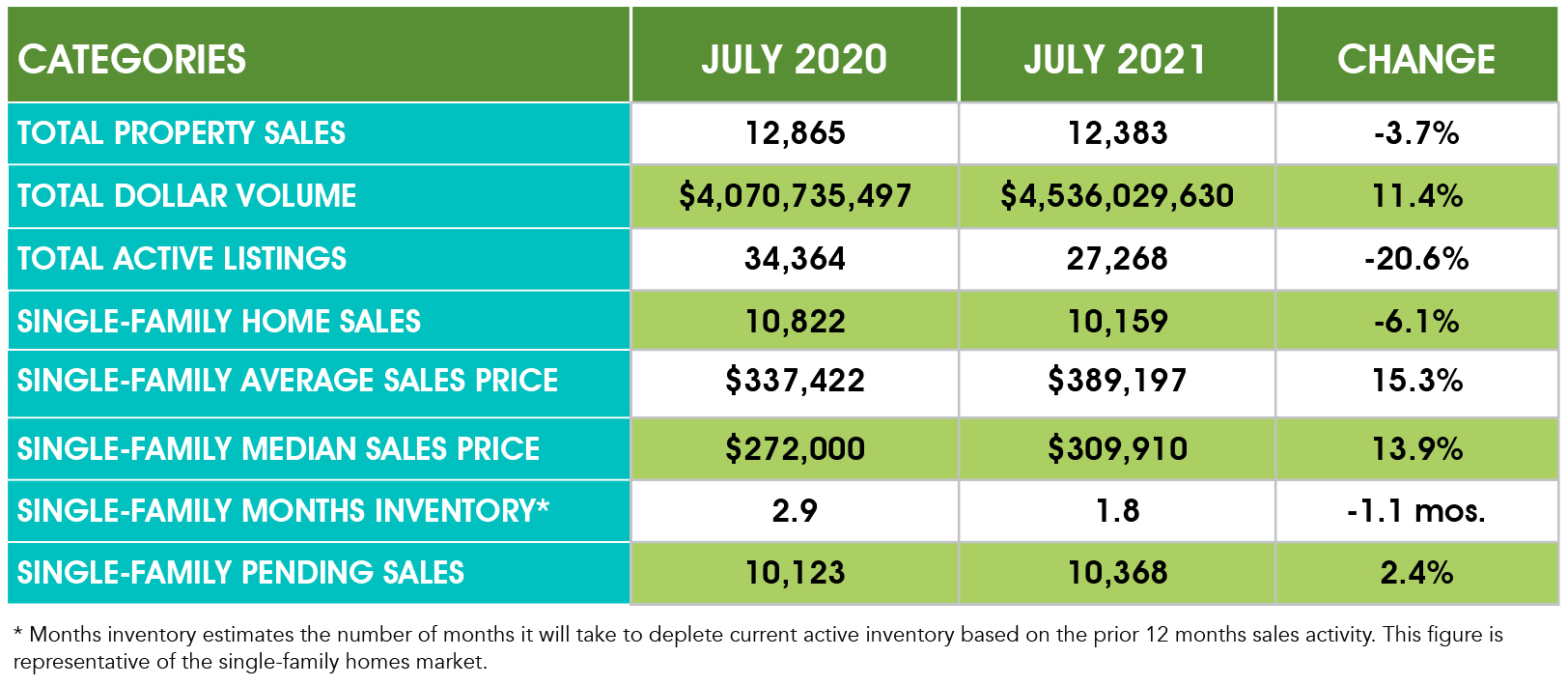 Single-family home sales and total property sales registered declines versus last July while total dollar volume rose. Pending sales increased 2.4 percent. However, total active listings — or the total number of available properties — remain 20.6 percent lower than this same time last year.